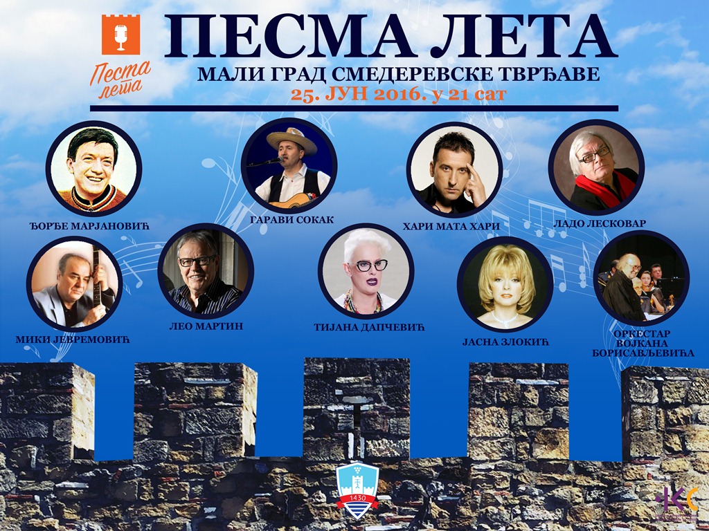 Под покровитељством Града Смедерева, у суботу, 25. јуна 2016. године, у Малом граду Смедеревске тврђаве у 21.00 сат, биће организован концерт популарне музике под називом Песма лета.