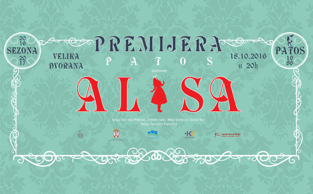 Овом приликом желимо да вас и премијерно позовемо на прву ПАТОС премијеру у новој сезони, представе АЛИСА, редитеља Салватореа Трамаћереа (Италија). Ово је уједно и наставак успешне сарадње са италијанским редитељем и позориштем Театро Кореја (Леће, Италија). Након представа БРАТ и ПЛАСТИЧНЕ БАШТЕ, овог пута се представља АЛИСА, комад настао по мотивима чувених књига Луиса Керола Алиса у земљи чуда и Алиса с онЕ стране огледала,који представља копродукцију позоришта ПАТОС и Центра за културу Смедерево. У представи играју Ада Вера Петковић, Анђелка Вулић, Милош Станковић и Душан Вулић. Представа је настала уз подршку Министарства културе и информисања Републике Србије. Премијера ће се одиграти у Великој дворани Центра за културу Смедерево, 28. октобра са почеком у 20.00 часова.
