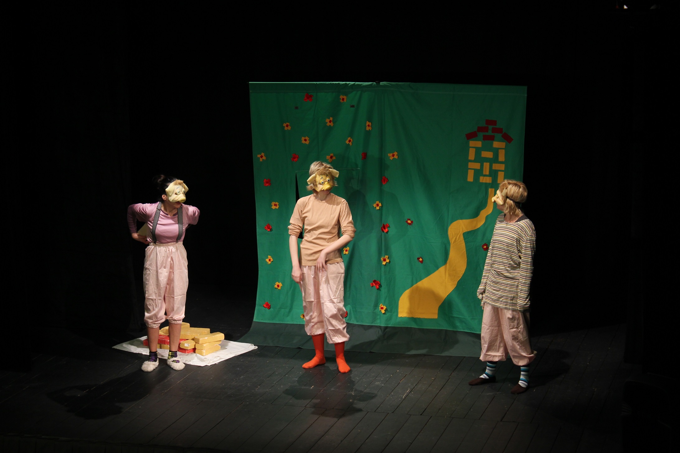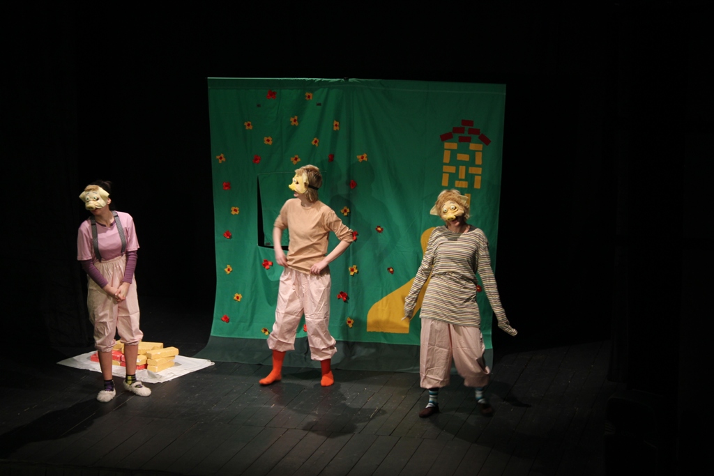 Ова позоришна бајка се изводи уз активно учешће деце, од којих ће неки у једном делу представе добити и мале глумачке задатке. Три прасета, Лажоје, Спавоје и Радоје безбрижно живе у шуми јер се вук одселио на север код баке Вукице. Најстарији брат, Радоје, који је вредан, одговоран, радан покушава да се избори са млађом браћом који се по цео дан играју, лажу и спавају. Међутим, они не слуте да је вук одлучио да се врати јер је бака Вукица вегетаријанац а њему се једе месо. Долази до надмудривања, опште панике и после низа преокрета Лажоје и Спавоје схватају да треба да се промене. Уз помоћ деце они саграде кућу, надмудре вука Вукоја и на крају се госте уз чај и колаче у кући од цигала коју су направили. Поред важних животних порука које јасно преноси, ова представа има за циљ и да помогне деци да се заљубе у позоришну уметност, а неки од њих ће добити прилику да стану на “даске које живот значе”.